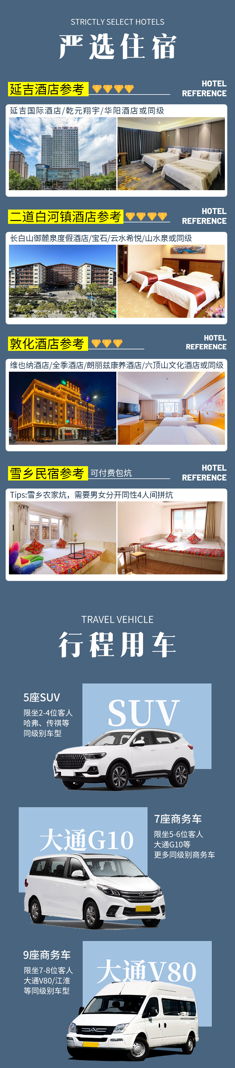 3、用车:2-4客人用5座SUV,5-6客人用7座商务车,7-8客人用9座商务车,根据人数安排用车大小,不指定用车(小团副驾驶及前后座位置需要轮流乘坐,望悉知);
