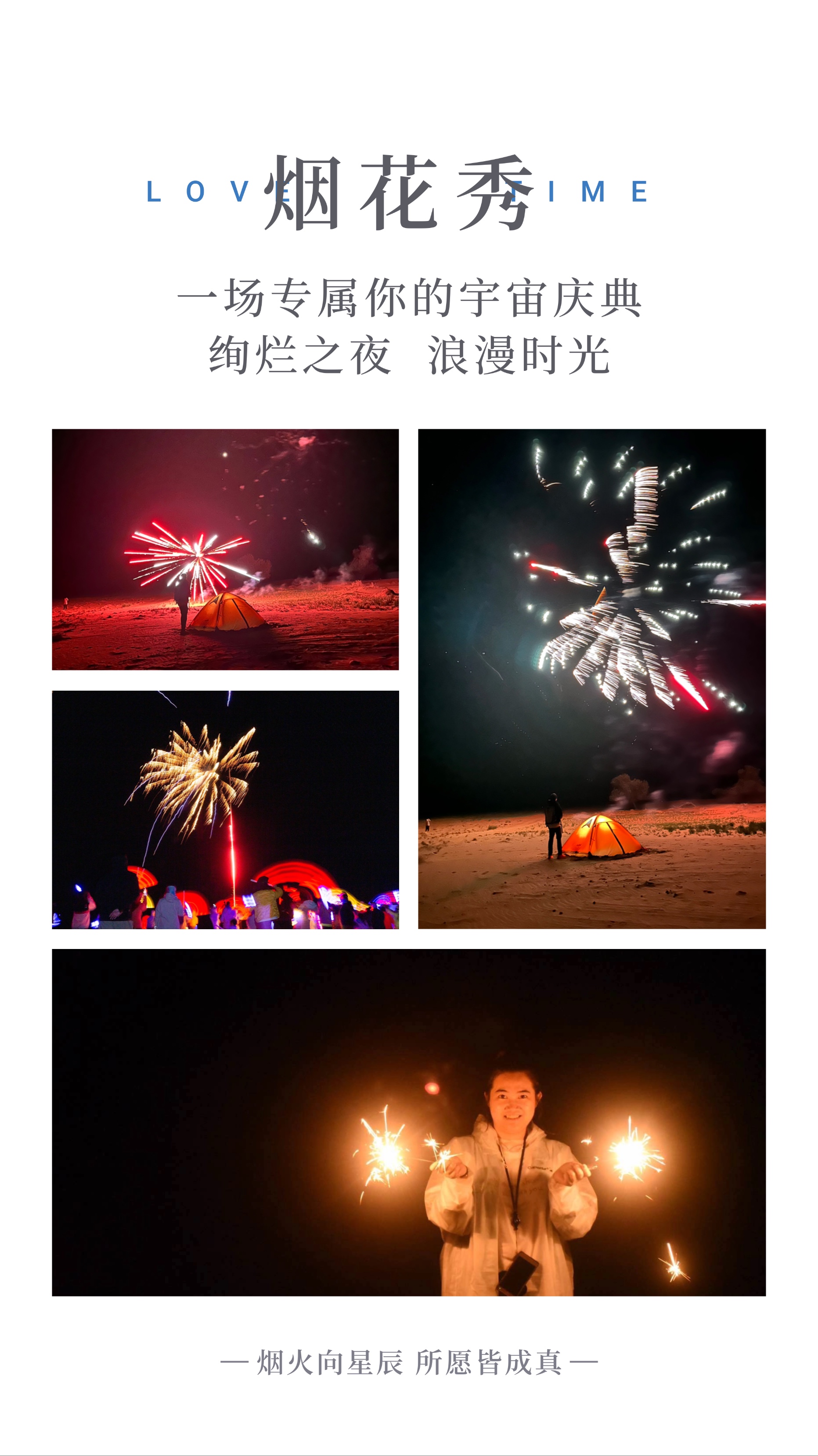 03 高空烟花:根据人数不同,提供高空烟花,让你在腾格里的这个夜留下终生难忘的美好回忆。