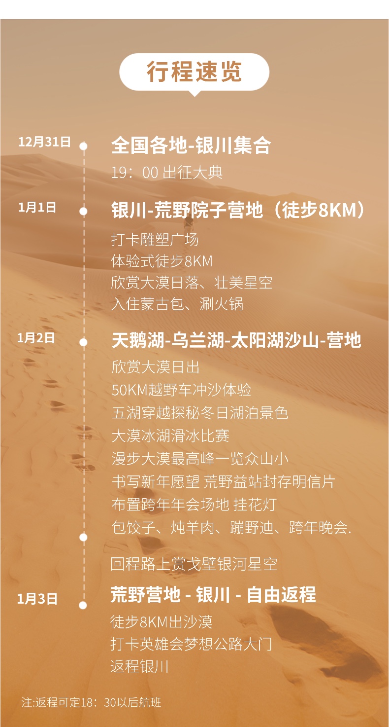 2.队员在自由活动期间,如果没有购买需求,不要和当地人讨价还价,也不要过多的驻足观看。如果队员自愿购物,请自行甄别产品质量。客人在沙漠徒步过程中以及在银川市区的购买行为属于个人行为,和此次徒步活动无关,购买过程中任何纠纷与组织方无关。