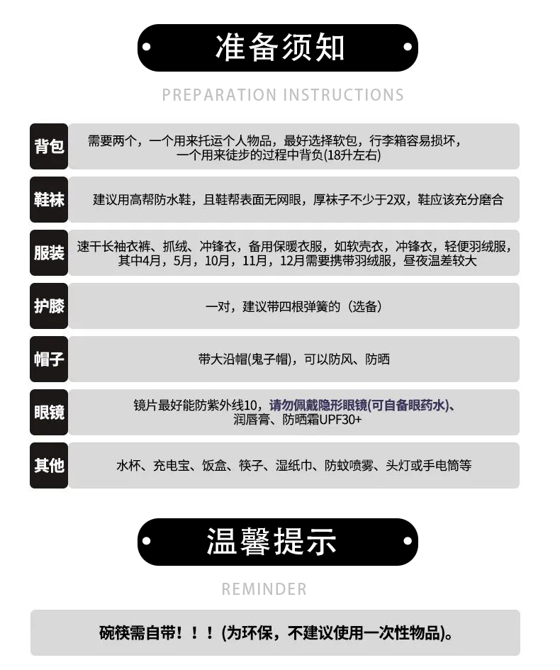 (1)大背包:限带一个大背包(70L以下)或旅行箱(26寸以下),也可以携带行李箱,物资车负责运输。