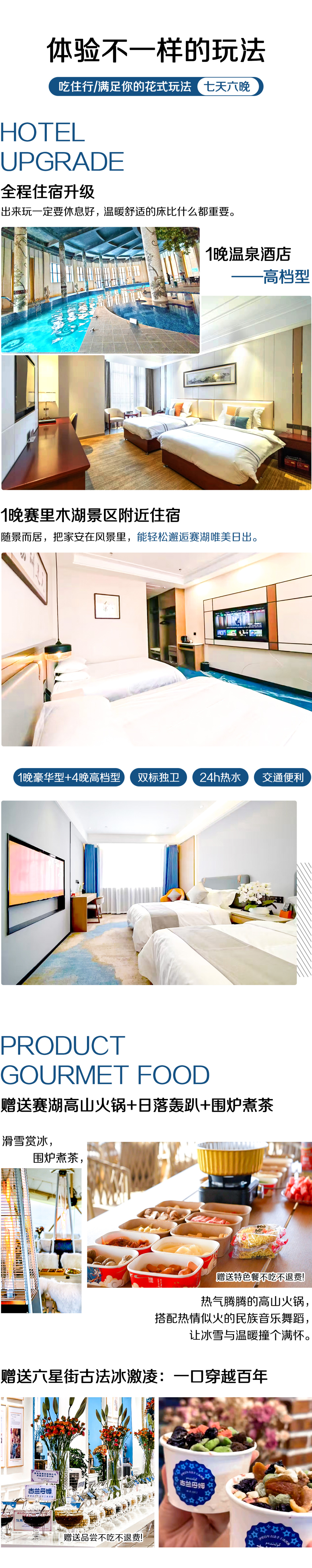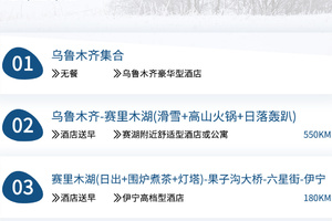 3.门票:赛里木湖国际滑雪场滑雪费用及租赁装备费用,以及费用包含以外的其他费用敬请自理。六星街、八卦城离街、安集海大峡谷暂不收费,如遇政策性收费,门票需自理。