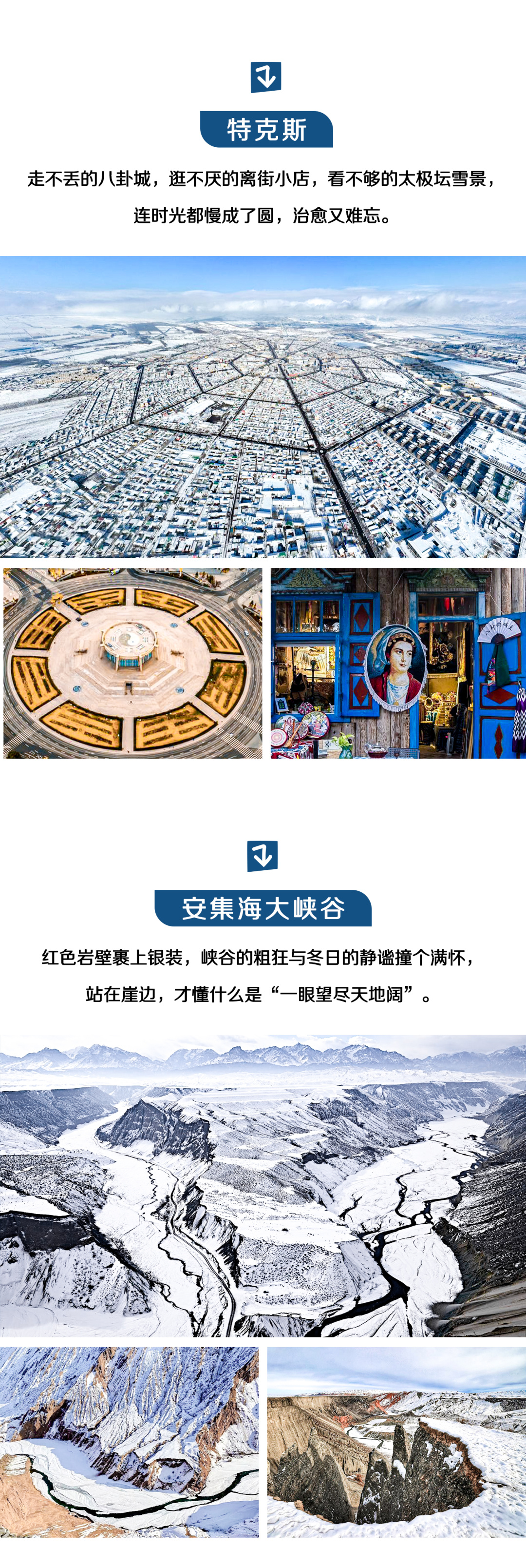 2.如遇大雪封路,前往安集海大峡谷的道路无法通行,替代景点为独山子大峡谷(门票自理)。