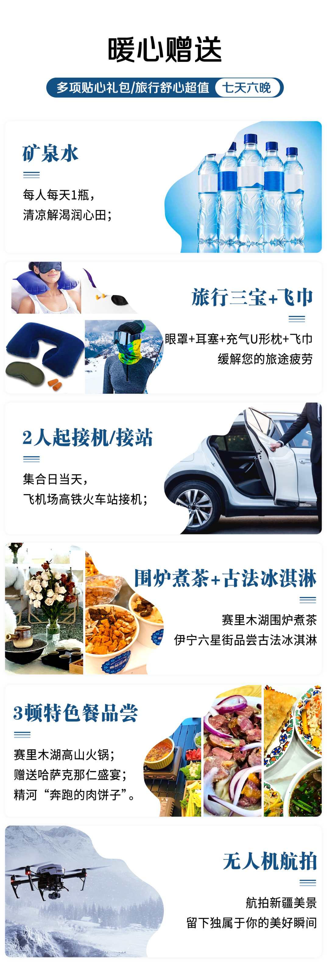3.赠送集合日当天免费接机/接站服务(2人起赠送,提前抵达者请自行前往酒店)。请提前至少3天告知航班/车次信息,如未告知,视为自动放弃。默认安排拼车(1小时内),如您不想等待,可自行打车或搭乘地铁前往酒店(费用自理)。抵达乌鲁木齐机场/火车站后,请主动联系接机人员确认上车位置,如出现等候的情况,请给予谅解。不含送机及送站服务,送机(站)服务:5座车100元/辆、7座车200元/辆,如需要请提前至少1天告知工作人员。
