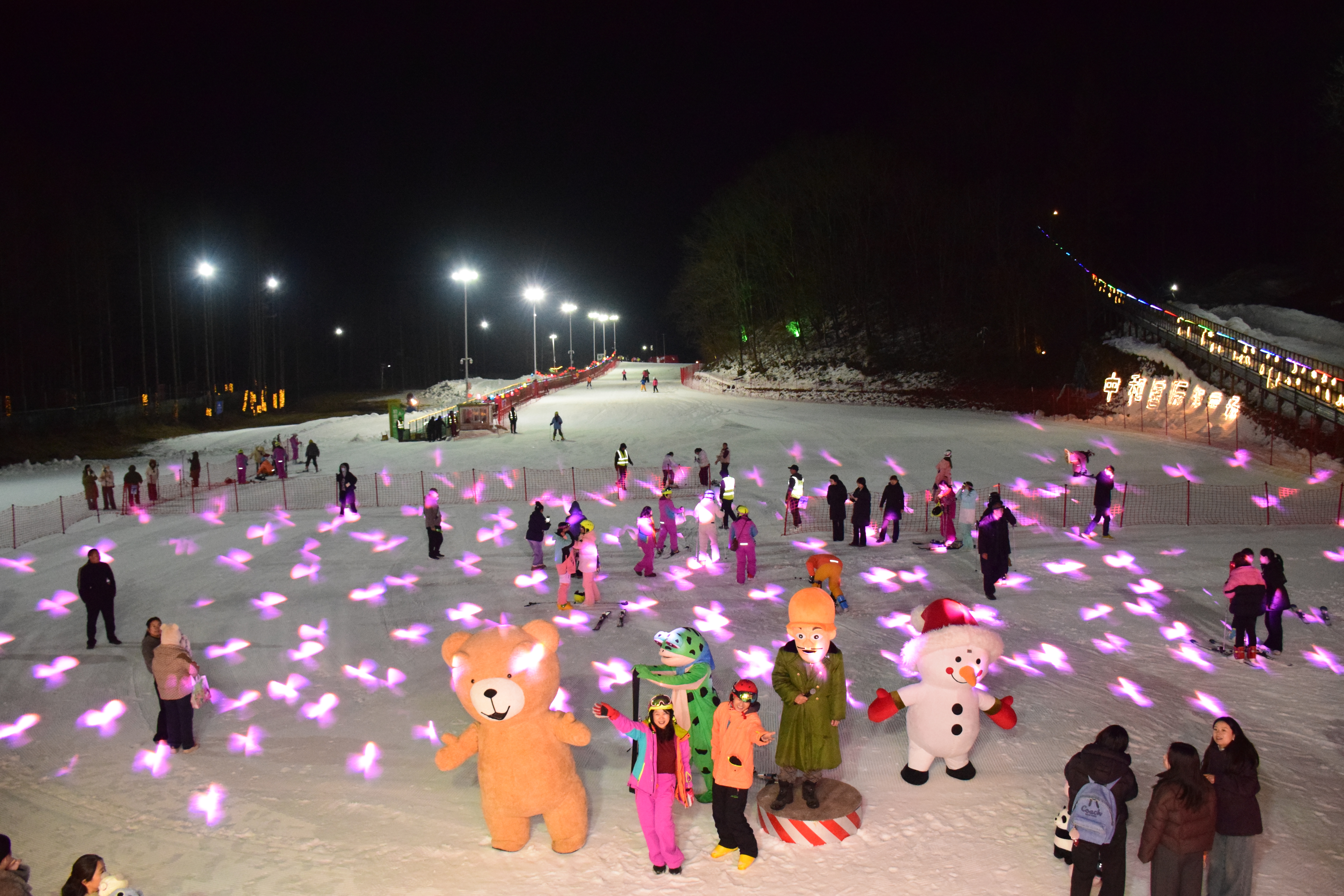 每晚6:30起,在神农架中和国际滑雪场,灯光点亮,晶莹剔透的冰雪世界瞬间变得美轮美奂,滑雪场上,正上演着热闹非凡的夜滑狂欢。