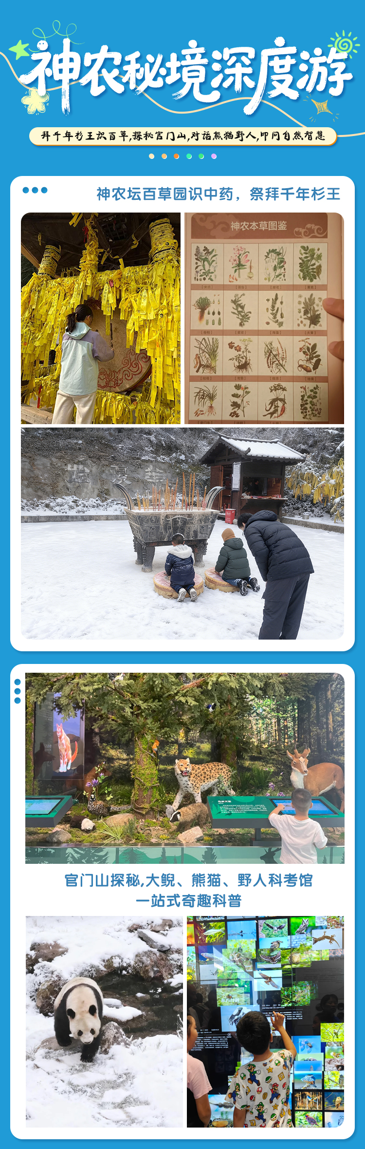 上午:早餐后前往神农坛,了解炎帝神农氏的传说与功绩,参观千年杉王和百草园