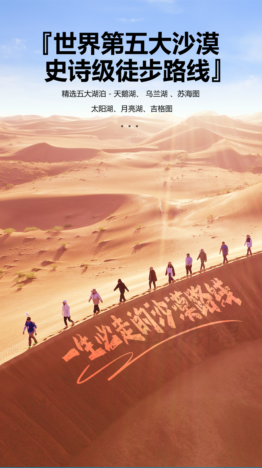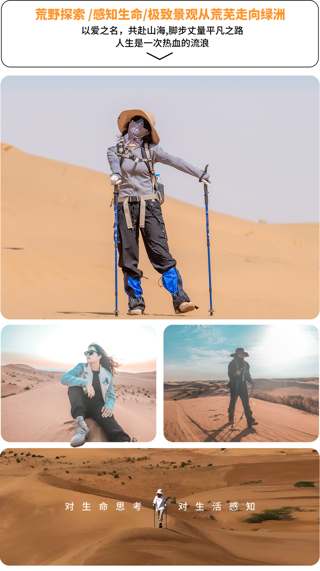 浩瀚的沙漠随处都是生命奇迹,你很有可能是地球诞生以来第一个踩在这片土地上的人类。徒步在某些时刻就是人生的一次停泊,远离繁杂的生活,走向陌生的远方。在行走中,清理自己的口袋,把烦恼、琐事、情绪……,一点点都丢在途中。理清思绪或者就是放空自己,把更多的位置空出来,让自己活得更轻松、更自在。