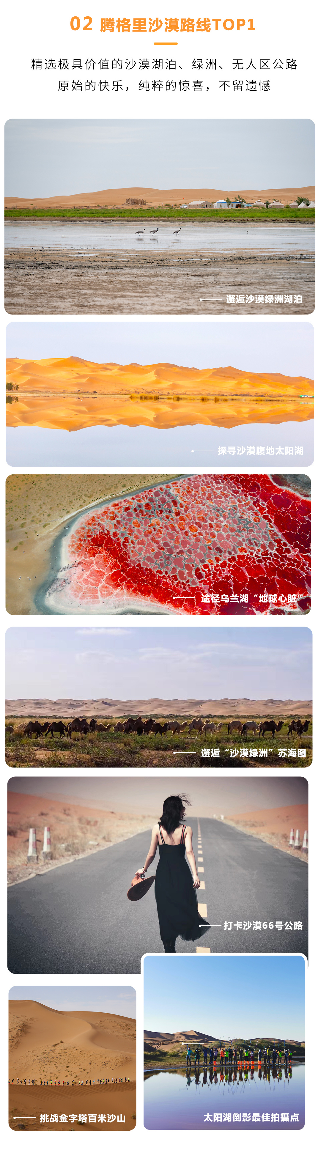 今天是全程最壮观的一天,高耸入云的沙山,蔚蓝的湖泊,曼妙的沙漠曲线都在你的脚下,领队会在沙山之巅带大家滑沙。