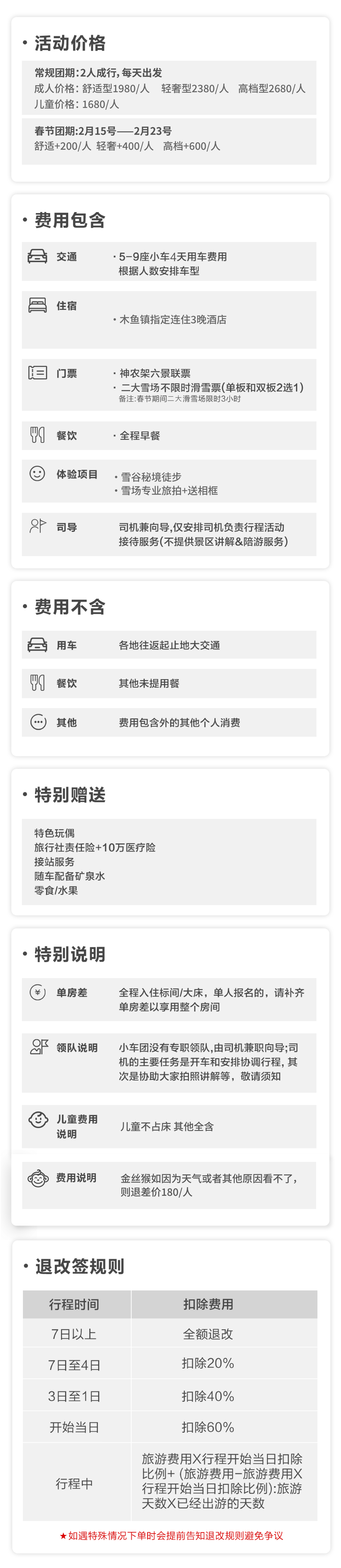 下午(约14:00):活动结束后,乘车前往神农架高铁站(约1小时)或兴山站(约2小时车程)或宜昌东站/三峡机场(约4小时车程)。送宜昌请务必预订晚上19:00以后出发的火车或飞机,以确保有充足的缓冲时间。