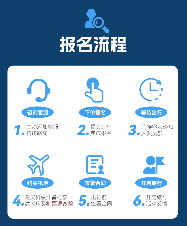 【出团通知】:集合日前3日18:00之前,工作人员发送出团短信通知到您预留的手机上(包括集合酒店名称、地址、电话,微信群二维码以及注意事项等);集合日当日工作人员会再次发消息通知。