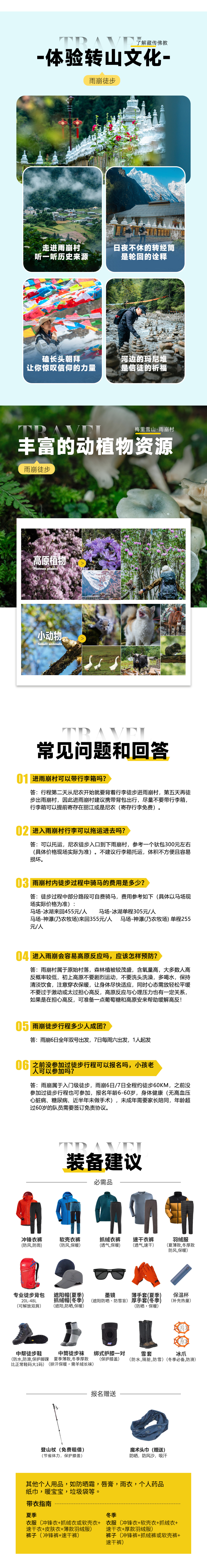 3.雨崩早晚比较冷,需准备手套、帽子、透气保暖内衣、加绒冲锋衣,冲锋裤,一件羽绒服备用,徒步过程中可能会比较热,需备速干衣。