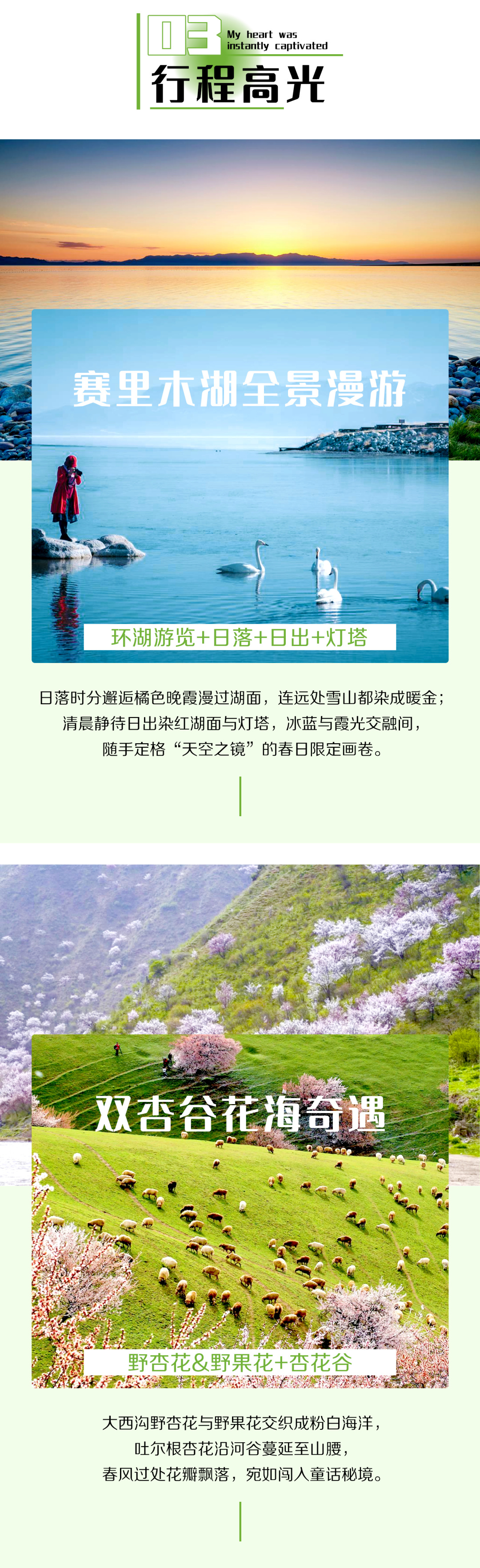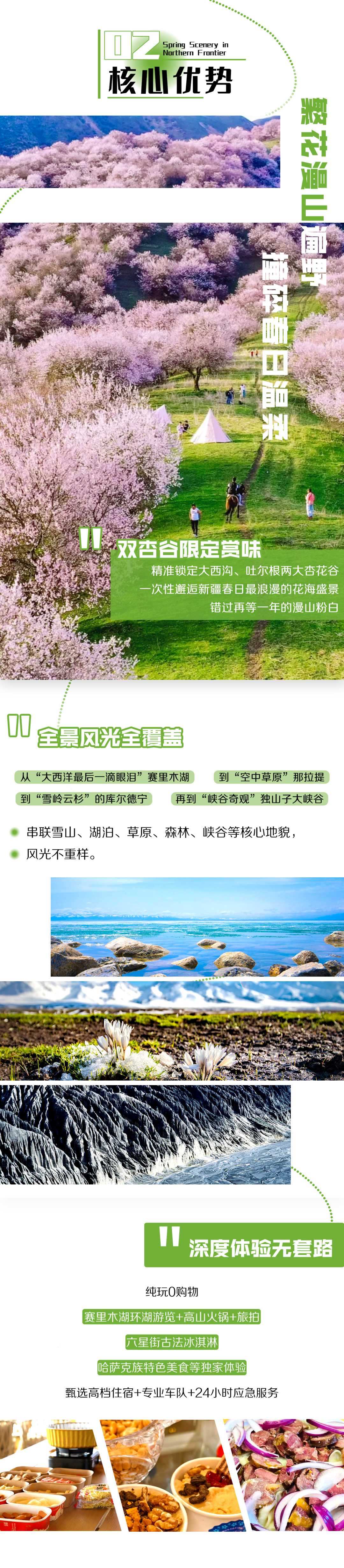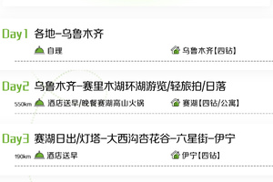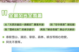 3. 全程景区门票+区间车:赛里木湖门票+区间车、大西沟杏花谷门票+区间车、吐尔根杏花沟门票+区间车、那拉提草原门票+空中草原区间车、库尔德宁门票+区间车、木特塔尔沙漠门票+区间车、独山子大峡谷门票。