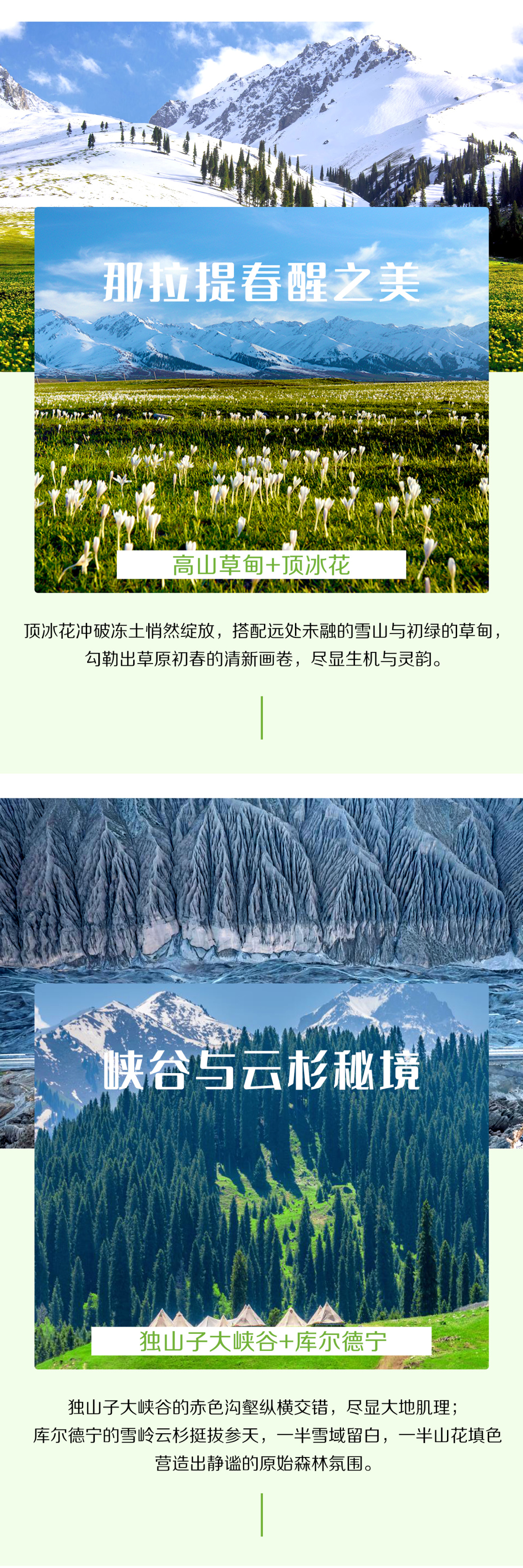 今日出发直奔吐尔根乡境内的杏花沟。吐尔根杏花沟是中世纪遗留的一片原始野杏林,野杏林占地约3万多亩。每年漫山遍野的杏花开放,方圆几公里外都能闻到清新的杏花香味。后前往空中草原——那拉提,集蓝天白云、冰川雪峰、森林草原、峡谷河流于一体的那拉提草原,4月-6月是最好的赏花季。4月初当其他野花还在等待生长时,顶冰花已经破雪而出,花瓣内敛地半开着,茎干看上去细嫩柔软,但它确有破雪而生的力量,游玩结束后,邂逅精致下午茶,慢享草原秘境的惬意时光,适时前往今日住宿地。