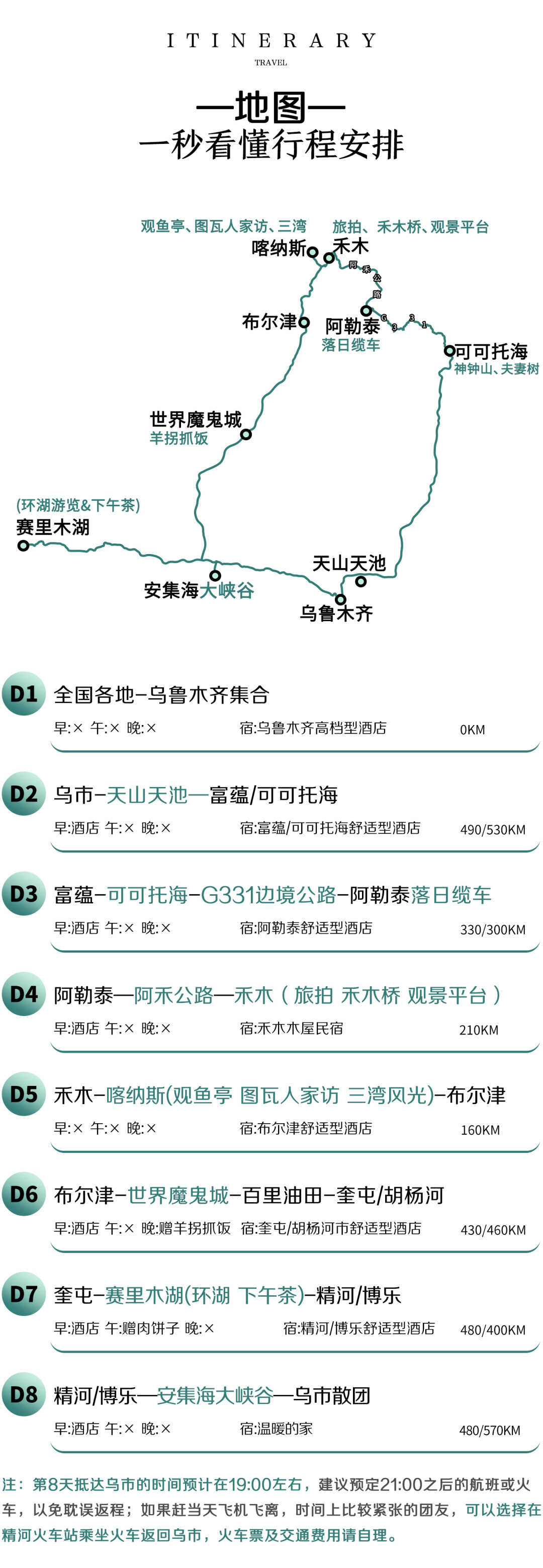 4. 抵达乌市的时间预计在19:00左右,计划今天返程的团友,建议预订21:00之后的航班或火车,以免耽误返程;如果赶当天下午乌鲁木齐飞机飞离,时间上比较紧张的团友,可以选择在精河南乘坐火车返回乌市,后前往乌市国际机场,火车票及交通费用请自理。