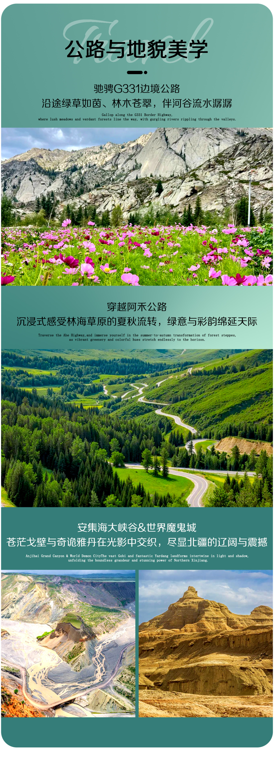 今日早起前往可可托海国家地质公园,这里的矿石资源丰富,稀有金属矿藏在全国名列前茅,曾替国家偿还了前苏联1/3的债务,在地质界熠熠生辉,是名副其实的英雄矿。额尔齐斯河从这里流淌,滋润完北疆这片沃土后去往西西伯利亚,最后汇入北冰洋。团友可换乘区间车前往神钟山,沿途的山涧溪流,松柏桦树,让你目不暇接,仰望神钟山,山体表面无植被也无泥土,竖道的沟壑犹如凝固的瀑布,神奇极了。后沿G331 边境公路向阿勒泰行驶,沿途雪山、草原、戈壁交替出现,远眺哈萨克斯坦边境风光,感受 “一步一景” 的边境风情。抵达阿勒泰后前往将军山,坐着缆车上山,随着海拔升高,城市灯光像打翻的星河在脚下铺开,当夕阳跌进阿尔泰山的怀抱,粉橘色天际线将山峦晕染成流动的金色油画,听着耳边动感的音乐,人世间的浪漫莫过于此。后前往酒店入住。