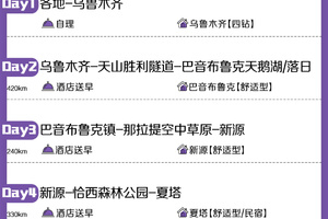 3. 全程所有景点区间车不含。新疆的景区交通车价格变动较大,故全程区间车费用自理,参考价格:巴音布鲁克区间车65元/人、那拉提空中草原区间车40元/人、恰西森林公园区间车30元/人、夏塔景区区间车60元/人、昭苏湿地公园区间车20元/人、喀拉峻大草原区间车70元/人、赛里木湖区间车75元/人、木特塔尔沙漠区间车15元/人(以景区最新价格为准)。