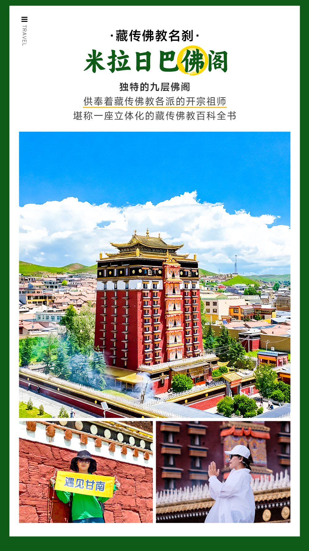 早餐后,我们乘车前往庄严宝相红墙金顶的【米拉日巴佛阁】(车程约3小时,165公里)藏区唯一一座供奉藏传佛教各派宗师的名刹。米拉日巴佛阁楼高共九层,供奉以米拉日巴尊者及其弟子为主的藏传佛教各派的开宗祖师,有以金刚为主的四密乘的众多佛像、菩萨、护法神等各类佛像1720尊。楼内壁画琳琅满目,与彩绘、唐卡、塑像浑然一体,颇具宗教神秘的色彩。