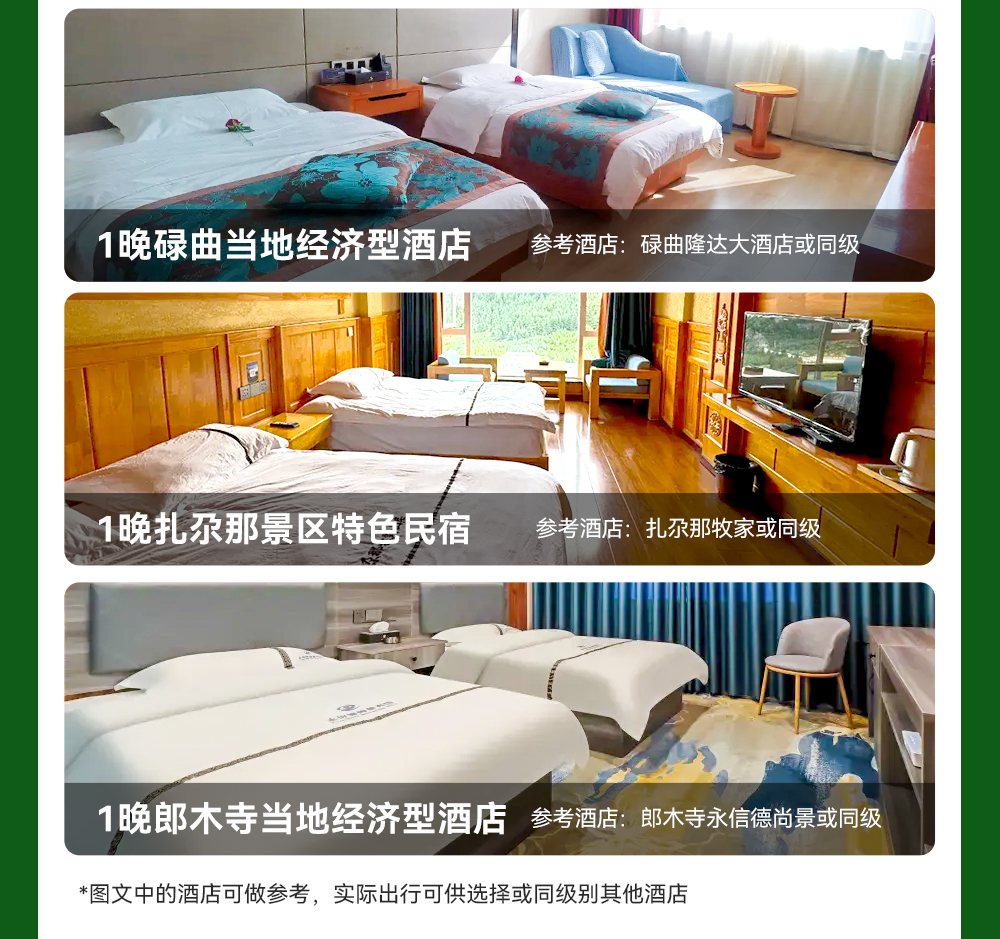 3、 行程中的所列的酒店类型,2星/2钻=经济型;3星/3钻=舒适型;4星/4钻=高档型;5星/5钻=豪华型;意为评定或条件到达相应标准的酒店,少部分地区,由于政策等因素,可能存在酒店条件满足,但未进行星钻评定的情况;