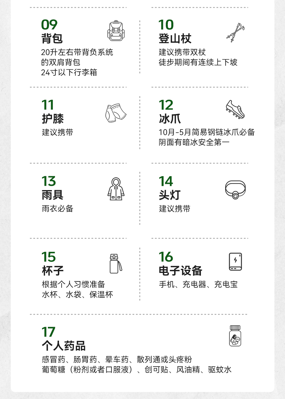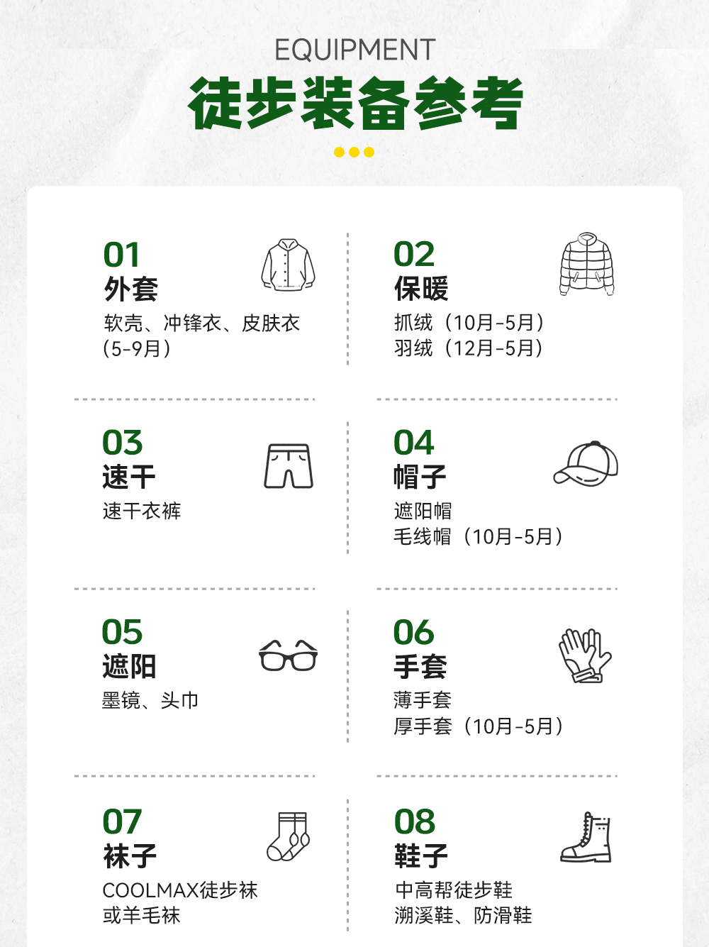 ①衣服:5/6月准备厚外套+羽绒服,穿长袖+长裤;7/8月防晒服+短袖即可,早晚准备秋季外套,9/10月准备秋季外套+羽绒服,沿途紫外线强记得带防晒霜和墨镜